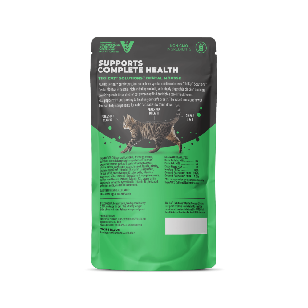 Supports Complete Health. Tiki Cat® Solutions™ Dental Mousse is protein-rich and silky smooth with peppermint and parsley to freshen your cat’s breath.