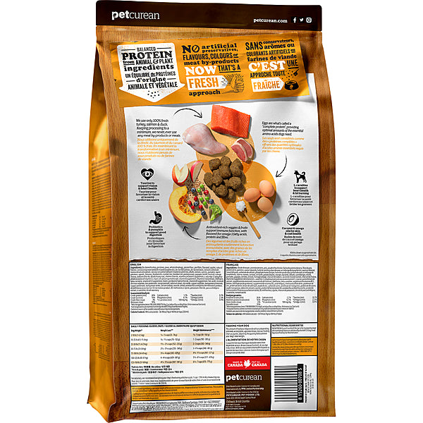 Ingredients: de-boned turkey, potato flour, peas, apples, whole dried egg, pea fibre, tomato, potatoes, flaxseed, canola oil (preserved with mixed tocopherols), natural flavour, salmon, de-boned duck, sundried alfalfa, coconut oil (preserved with mixed tocopherols), carrots, pumpkin, bananas, blueberries, cranberries, raspberries, blackberries, papayas, pineapple, grapefruit, lentil beans, broccoli, spinach, cottage cheese, alfalfa sprouts, calcium carbonate, dicalcium phosphate, lecithin, sodium chloride, potassium chloride, vitamins (vitamin E supplement, L-ascorbyl-2-polyphosphate (a source of vitamin C), niacin, vitamin A supplement, thiamine mononitrate, d-calcium pantothenate, pyridoxine hydrochloride, riboflavin, beta-carotene, vitamin D3 supplement, folic acid, biotin, vitamin B12 supplement), minerals (zinc proteinate, ferrous sulphate, zinc oxide, iron proteinate, copper sulphate, copper proteinate, manganese proteinate, manganous oxide, calcium iodate, selenium yeast), taurine, DL-methionine, L-lysine, dried chicory root, dried Lactobacillus acidophilus fermentation product, dried Enterococcus faecium fermentation product, yucca schidigera extract, L-carnitine, dried rosemary