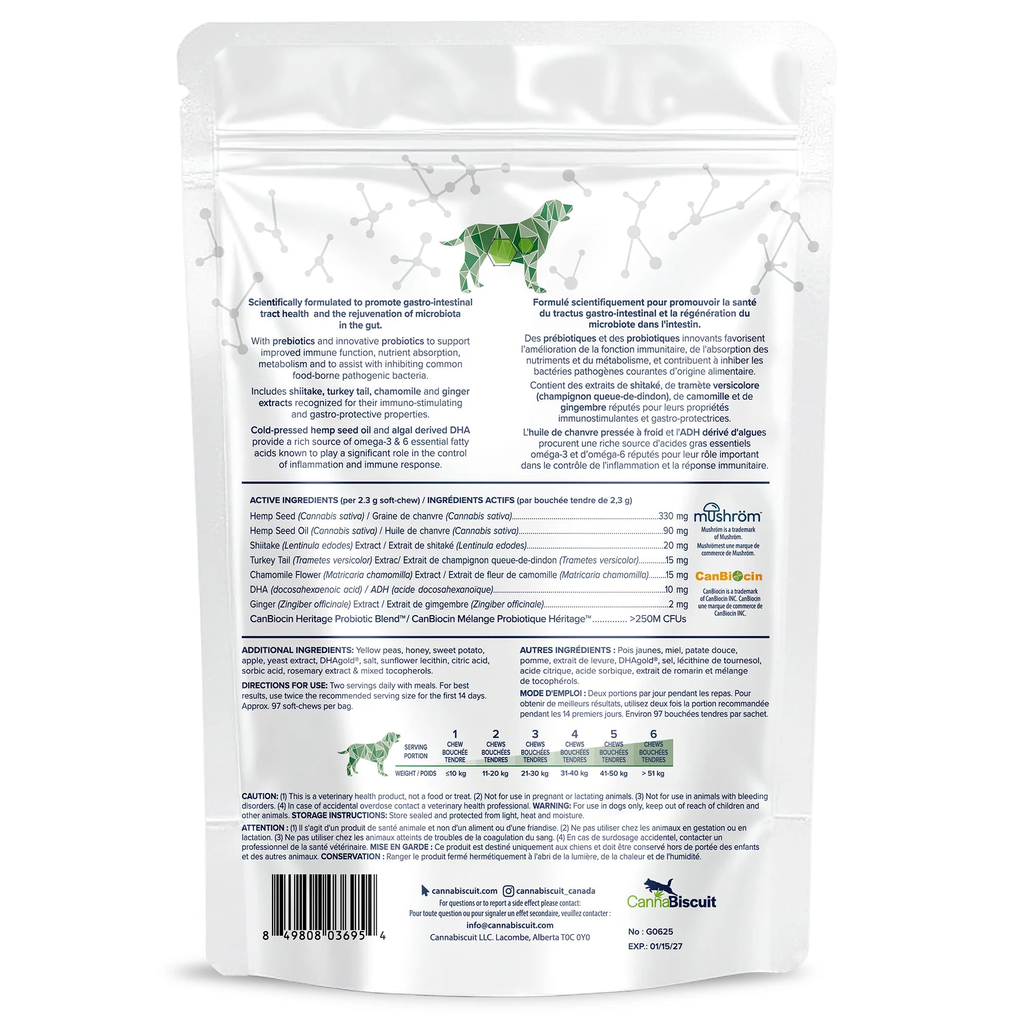 Includes shiitake, turkey tail, and chamomile recognized for their immuno-stimulating and gastro-protective properties. Each 225g bag contains approximately 97 soft chews.
