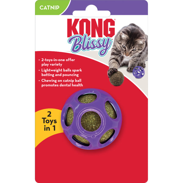 KONG Blissy Moon delivers double the fun with 2 different lightweight, rolling toys to satisfy hunting instincts. Purple ball’s intriguing shape invites batting, chasing and pouncing. Dense ball of potent KONG Premium North American Catnip prolongs play and chewing on it helps clean teeth and gums for multi-sensory delight.