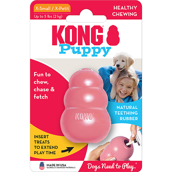 A stuffed Puppy Kong occupies busy little ones while allowing pet parents the freedom to attend to their unique needs. Want to make crate training easier or extend play time? Be sure to stuff with puppy kibble and a dash of peanut butter. Add to the fun by including Kong Puppy Snacks and top with Kong Puppy Easy Treat.