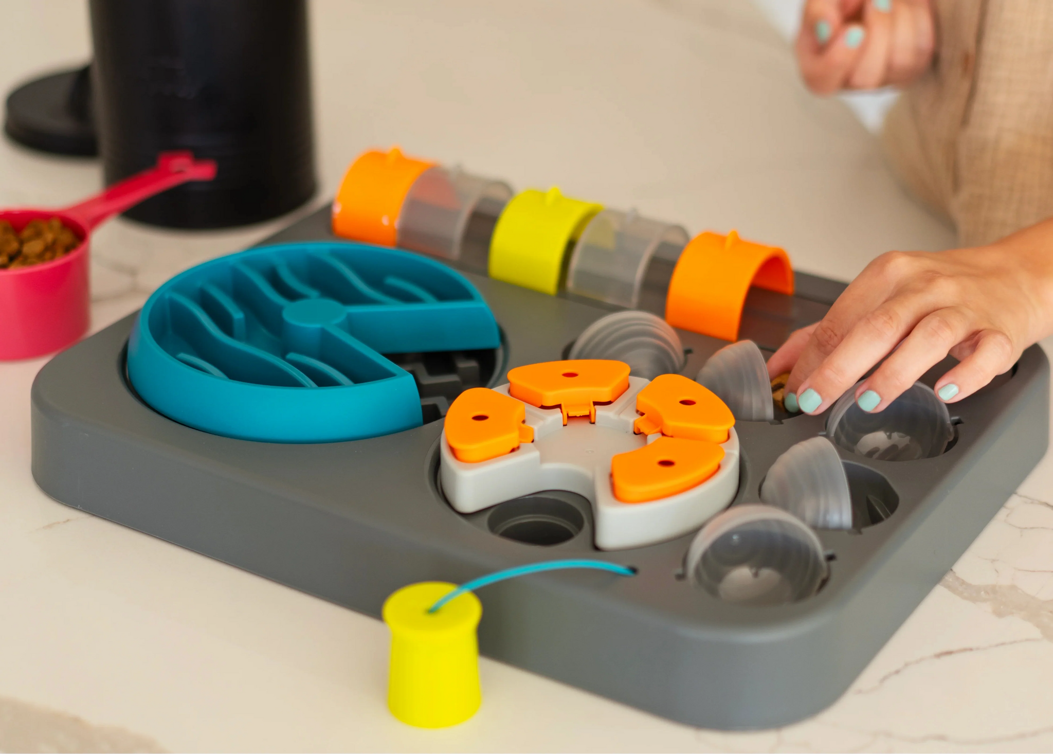 The multiple compartments, surfaces and sliding parts make finding food an adventure, engaging their minds and stimulating their natural desire to sniff, paw and forage.